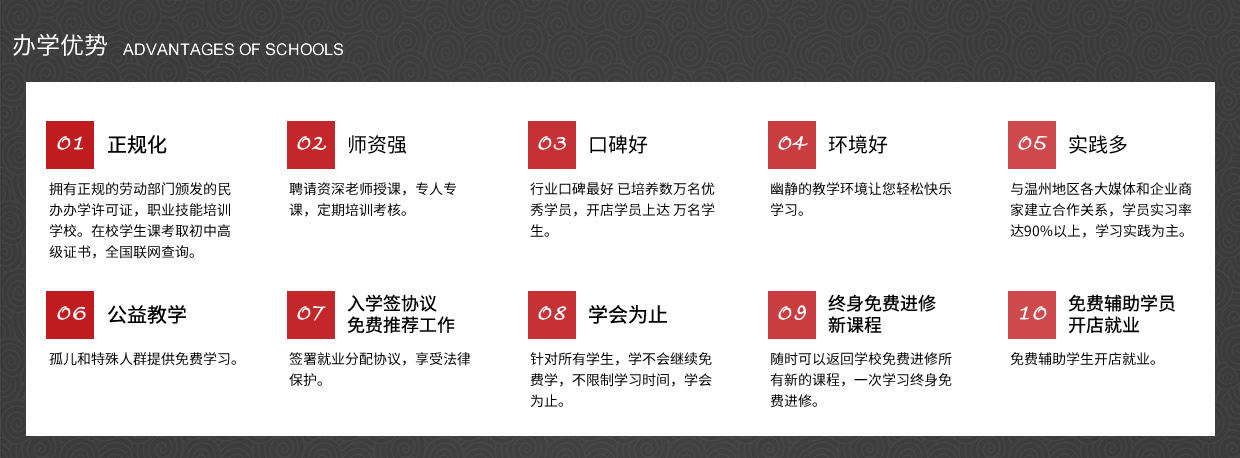 我校以培養(yǎng)實用型專業(yè)人才為目標,理論學習、操作訓練與專業(yè)實踐三位一體,實行一對一的教學模式,常年招生,男女不限。畢業(yè)后推薦工作、 主要是以理論為輔實操為主的教學模式授課。老師手把手教、一對一輔導(dǎo),為學員量身定做課程,保證學會為止、 中途不收取任何費用,(無任何隱形消費)進修新的課程。、簽約教學、幫助學員開店就業(yè),免費試學(讓您全方位的體驗我們的專業(yè)、讓你不花一分冤枉錢。)
